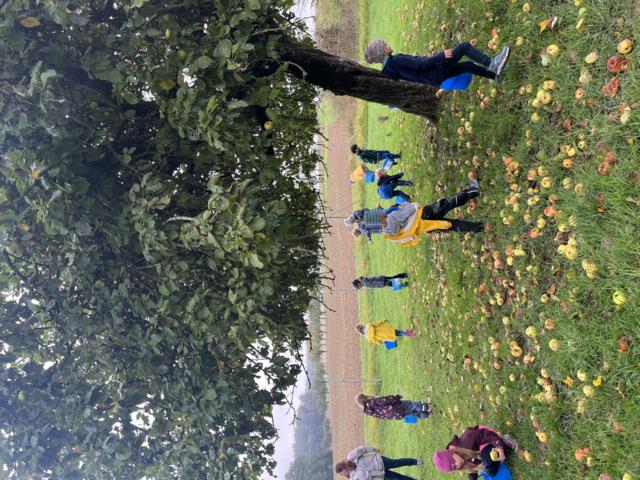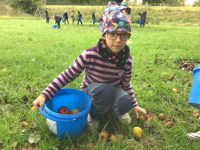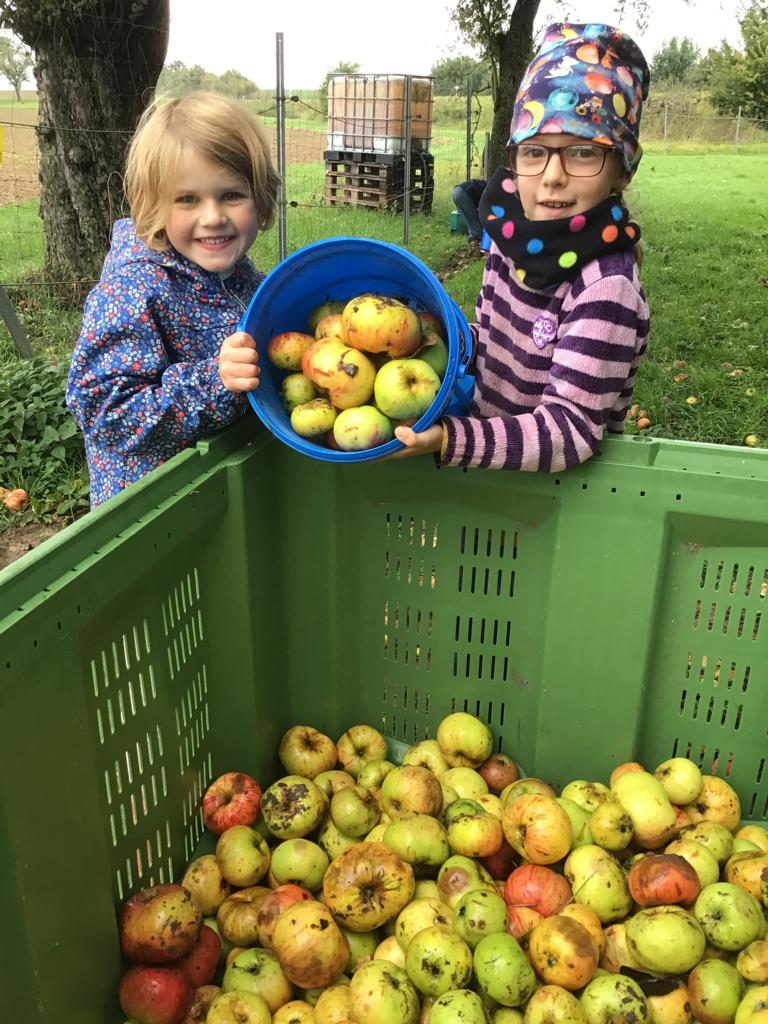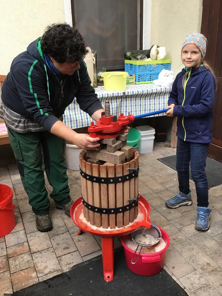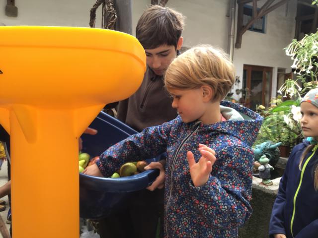 Ein Höhepunkt war der gemeinsame Ausflug mit der Gruppe 39 zu dem Erlebnisbauernhof in Limbachshof. Dort hatten die Kinder die Gelegenheit selbst Äpfel aufzusammeln und danach beim Pressen des Saftes zu helfen. Jedes Kind durfte die Saftpresse eigenständig bedienen und dabei erleben, wie aus dem Obst frischer Apfelsaft entsteht. Dabei erklärte die Bäuerin, dass der Saft besonders aromatisch und süß schmeckt, wenn drei verschiedene Apfelsorten gemischt werden.