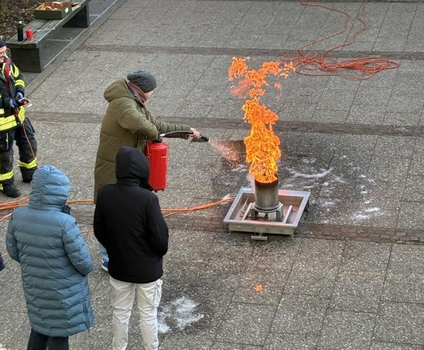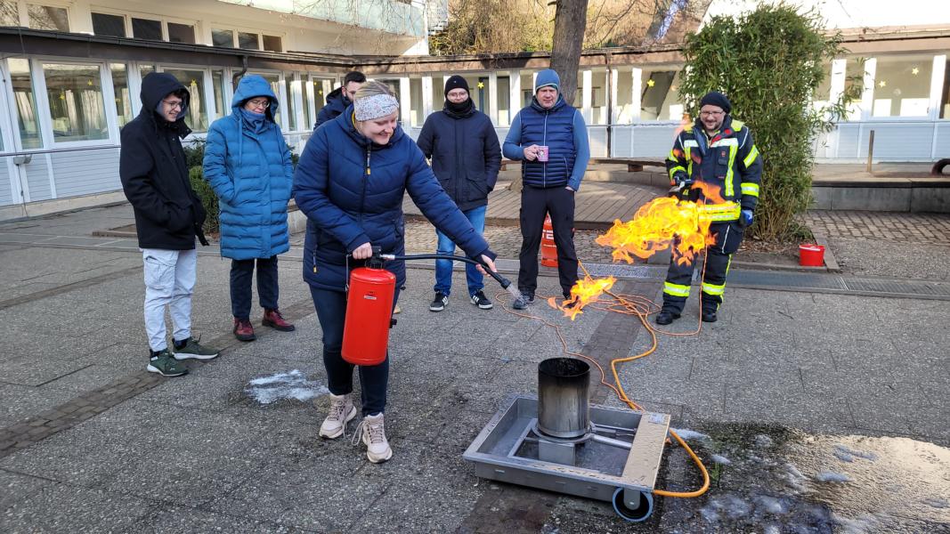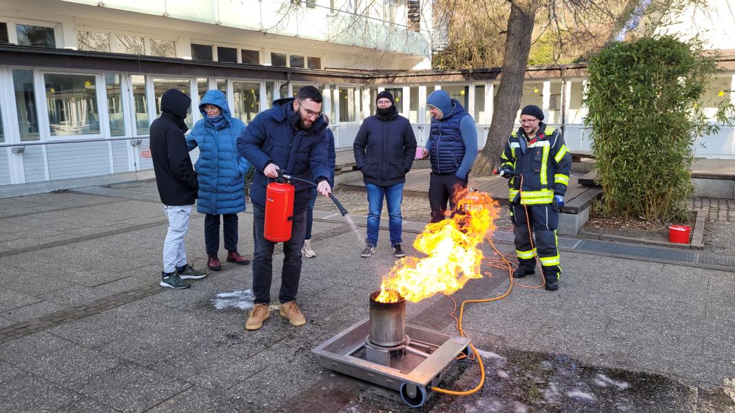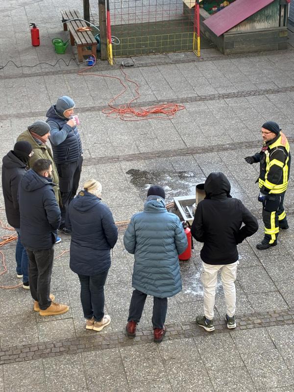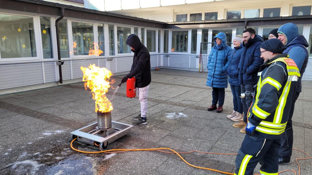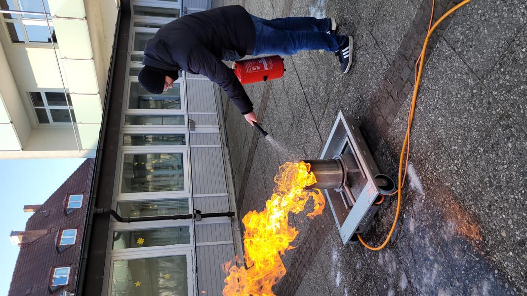 In der Praxis mussten alle pädagogischen Mitarbeiterinnen und Mitarbeiter, alle Mitarbeiterinnen der Hauswirtschaft, Hausmeisterei und Verwaltung sowie auch Tagesheimleiter Joachim Volpert einen Entstehungsbrand in einem Mülleimer – dargestellt durch eine gasbefeuerte Übungsanlage – mit einem Übungsfeuerlöscher bekämpfen.