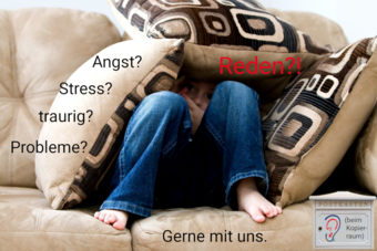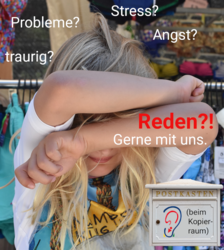 - Du schreibst etwas: Dein Problem, wie es dir geht. Oder dass du ein persönliches Gespräch brauchst. Du wirfst einen Zeiitel in den Briefkasten vom offenen Ohr in der Ecke am Kopieraum. Im Tagesheim ist auch so ein Briefkasten geplant. Nicht suchen, den gibts derzeit noch nicht, aber bald.